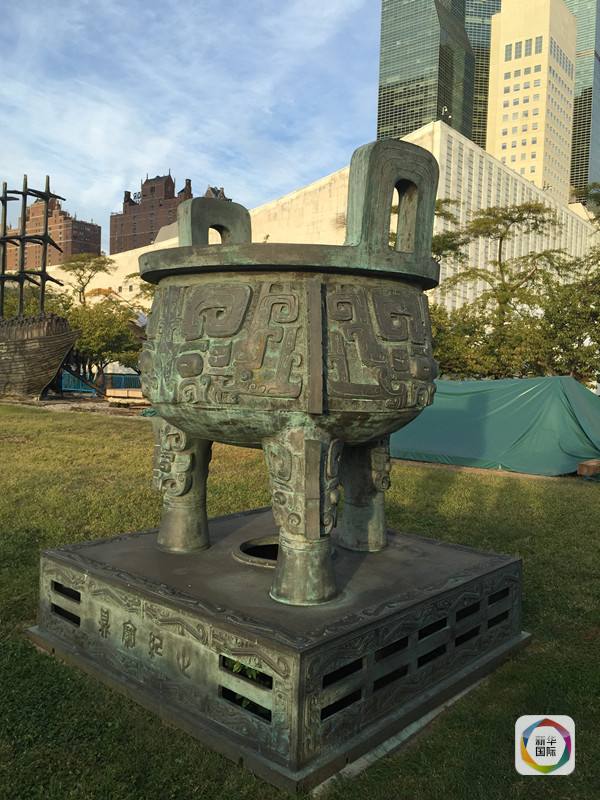 1995年10月,為紀(jì)念聯(lián)合國(guó)成立50周年,中國(guó)向聯(lián)合國(guó)紐約總部贈(zèng)送了一座重約1.5噸的“世紀(jì)寶鼎”。這座鼎目前安放在聯(lián)合國(guó)大樓北花園的草坪上,鼎座高0.5米,象征聯(lián)合國(guó)成立50周年;鼎身高2.1米,象征21世紀(jì);底座上飾56條夔龍,象征56個(gè)民族都是龍的傳人。