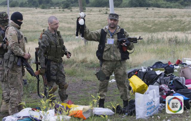 2014年7月18日,一名當(dāng)?shù)孛耖g武裝人員在烏克蘭頓涅茨克州格拉博夫附近的馬航客機(jī)墜機(jī)現(xiàn)場拿起一個玩具。新華社/美聯(lián)