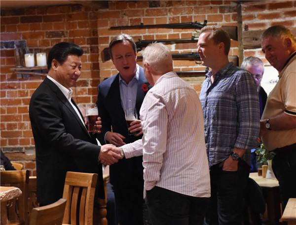 10月22日,國家主席習(xí)近平在契克斯首相鄉(xiāng)間別墅同英國首相卡梅倫再次會晤。會晤結(jié)束后,習(xí)近平在卡梅倫陪同下乘車前往當(dāng)?shù)匦℃?zhèn)體驗酒吧文化。(新華社記者饒愛民攝)