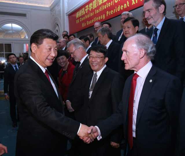 習近平指出,近年來,孔子學院在英國快速發(fā)展。目前,英國已經(jīng)建立起29所孔子學院和126個孔子課堂,數(shù)量居歐洲之首。全英孔子學院取得的碩果也是中英人文交流蓬勃發(fā)展的縮影。通過人文交流,中英兩國文化中的精華正在對兩國人民的思維方式和生活方式產(chǎn)生著奇妙的“化學反應”?!盀橹粎?,誨人不倦?!毕M谧魑唤處熢俳釉賲?,為中英友好事業(yè)添磚加瓦。希望孔子學院繼續(xù)秉承“相互尊重、友好協(xié)商、平等互利”的校訓,為傳播文化、溝通心靈、促進世界文明多樣性作出新的更大貢獻。