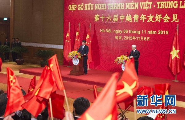 11月6日,中共中央總書(shū)記、國(guó)家主席習(xí)近平和越共中央總書(shū)記阮富仲在河內(nèi)共同會(huì)見(jiàn)參加第十六屆中越青年友好會(huì)見(jiàn)活動(dòng)的中越青年代表。新華社記者李學(xué)仁攝