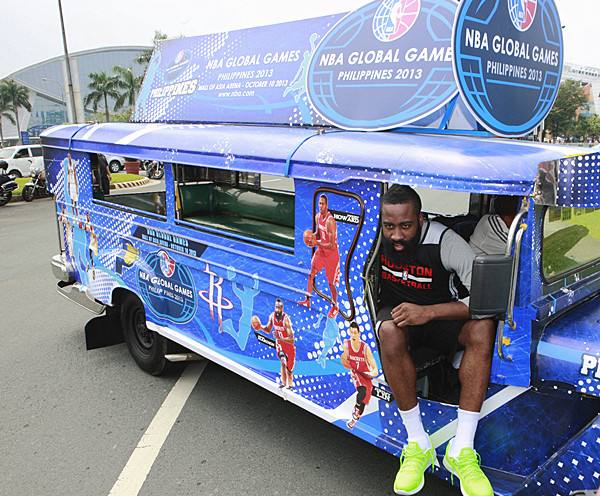 2013年10月8日,休斯敦火箭隊在菲律賓馬尼拉進(jìn)行調(diào)整訓(xùn)練期間,火箭隊球員哈登坐在一輛“吉普尼”巴士上。新華社發(fā)(宋穹攝)