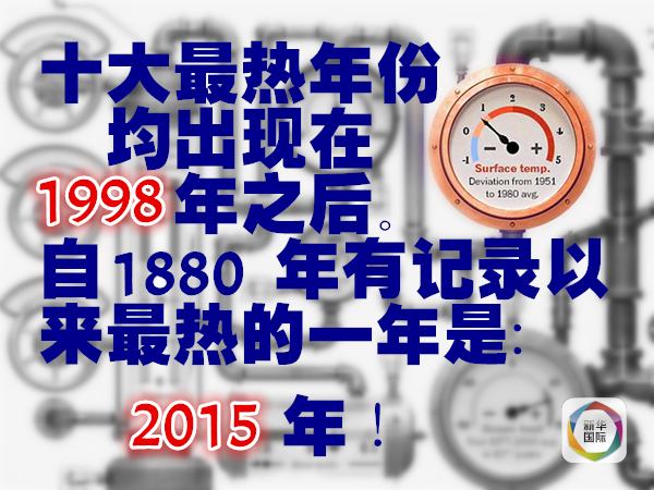 由于厄爾尼諾等現(xiàn)象的作用,地球每年平均氣溫略有差異不足為奇。但縱觀1880年有可靠記錄以來(lái)的歷年氣溫狀況可以看出,地球表面溫度呈爬高之勢(shì),10個(gè)氣溫最高的年份都出現(xiàn)在1998年之后,而2015年是目前為止最熱的一年。