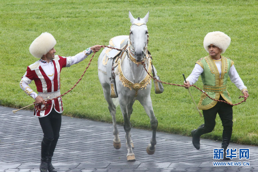 當(dāng)日,土庫(kù)曼斯坦為慶祝阿哈爾捷金馬(中國(guó)稱汗血馬)節(jié)在總統(tǒng)馬場(chǎng)舉行汗血馬選美大賽。一匹名為“別格汗”的8歲鼠灰色馬受到評(píng)委們的青睞,贏得2016年度“最美汗血馬”稱號(hào)。新華網(wǎng)記者 盧敬利 攝
