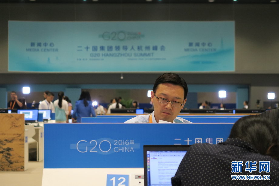 二十國集團工商峰會(B20)于9月3日至4日在杭州舉辦。作為G20機制的重要配套活動,B20是各國工商界參與全球經(jīng)濟治理和推動世界經(jīng)濟增長的重要平臺。圖為工商峰會開幕當(dāng)天,新聞中心內(nèi)記者忙碌的身影。新華網(wǎng) 陳競超 攝