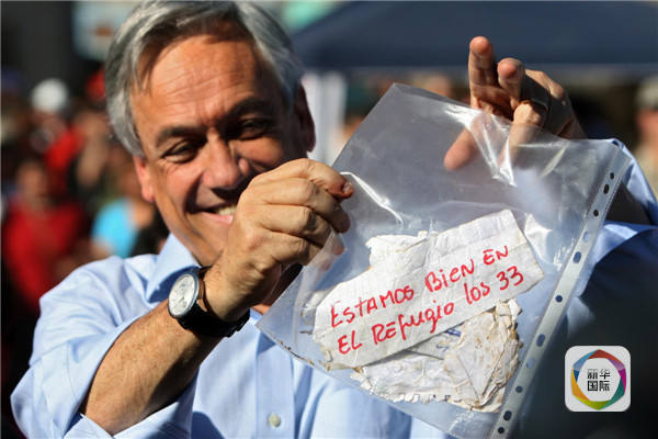 事故發(fā)生后第二天,時任智利總統(tǒng)皮涅拉承諾,政府將“竭盡全力”營救被困礦工。8月22日,經(jīng)過17天的鉆探搜尋,地面通往井下的生命通道被打通。鉆頭縮回后,礦工奧赫達傳回地面的字條立刻傳遍了世界:我們33人都在庇護所內(nèi),全部安好。