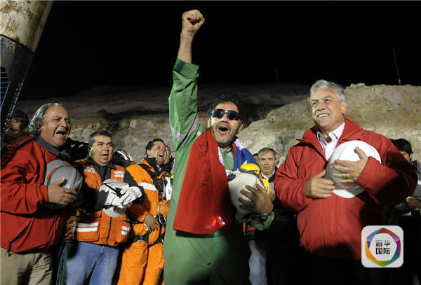 2010年10月13日,最后一名被困礦工路易斯·烏爾祖阿(中)成功升井后與皮涅拉(右)一同慶祝。(新華社發(fā))