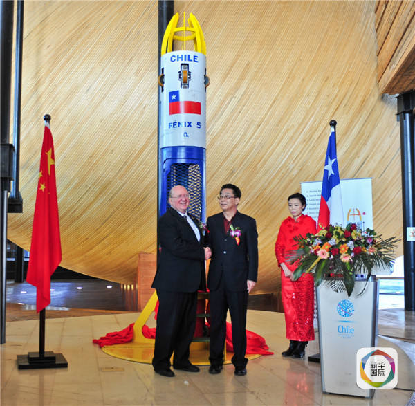 2014年1月10日,時任智利駐華大使路易斯·施密特(左一)與天津凱威投資集團有限公司董事長吳玉凱出席“鳳凰5號”揭幕儀式。(新華社記者翟健嵐攝)