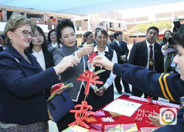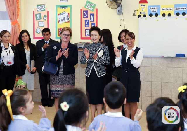 ??? 彭麗媛抵達(dá)時(shí),秘魯總統(tǒng)夫人蘭格和學(xué)校校長(zhǎng)在下車處迎接,校長(zhǎng)為彭麗媛獻(xiàn)上鮮花。若望二十三世秘中學(xué)校創(chuàng)辦于1962年,是從幼兒園到中學(xué)教育的全日制學(xué)校,也是秘魯乃至南美洲最具影響的華文學(xué)校之一。
