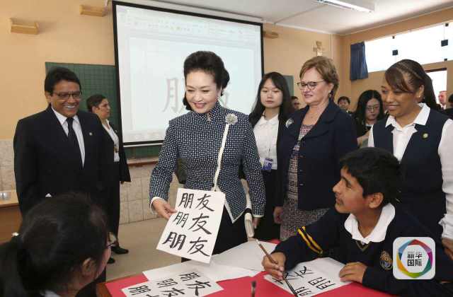 ??? 彭麗媛前往初中班教室觀摩書(shū)法課。十多名學(xué)生圍坐在三張長(zhǎng)桌前練習(xí)毛筆書(shū)法。他們今天練習(xí)的是“朋友”兩個(gè)字,彭麗媛稱贊他們寫(xiě)得很好。她還講述了中國(guó)古代書(shū)法家練習(xí)書(shū)法的故事,告訴學(xué)生們學(xué)習(xí)書(shū)法貴在堅(jiān)持,每天都要練習(xí)。