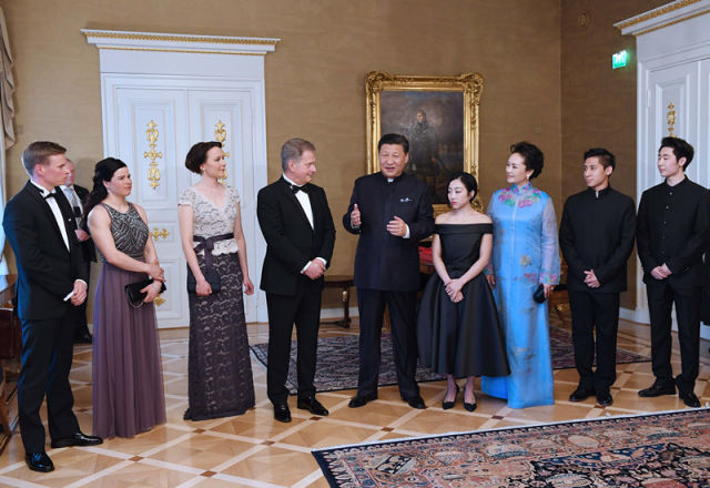 4月5日,國(guó)家主席習(xí)近平在赫爾辛基同芬蘭總統(tǒng)尼尼斯托舉行會(huì)談。會(huì)談前,習(xí)近平出席尼尼斯托在總統(tǒng)府庭院舉行的隆重歡迎儀式。這是習(xí)近平和夫人彭麗媛同尼尼斯托和夫人豪吉?dú)W在歡迎儀式上。(新華社記者蘭紅光攝)
