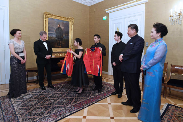 當(dāng)?shù)貢r(shí)間4月5日晚,國(guó)家主席習(xí)近平和芬蘭總統(tǒng)尼尼斯托在赫爾辛基共同會(huì)見(jiàn)剛剛參加完2017年世界花樣滑冰錦標(biāo)賽的中芬兩國(guó)冰雪運(yùn)動(dòng)員代表。習(xí)近平夫人彭麗媛和尼尼斯托夫人豪吉?dú)W參加會(huì)見(jiàn)。這是中國(guó)運(yùn)動(dòng)員向尼尼斯托和夫人豪吉?dú)W贈(zèng)送運(yùn)動(dòng)衣。(新華社記者饒愛(ài)民攝)(新華社客戶(hù)端報(bào)道)