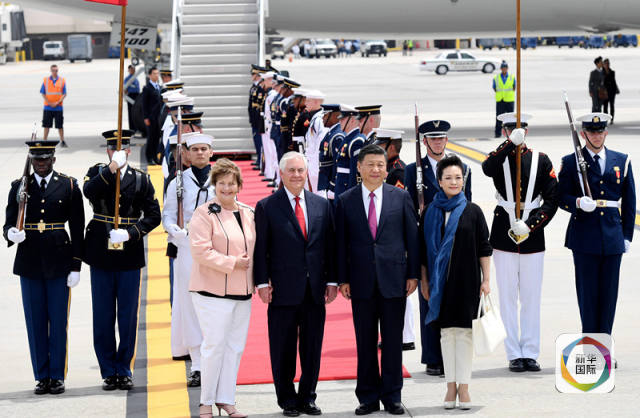 4月6日,國家主席習(xí)近平乘專機(jī)抵達(dá)美國佛羅里達(dá)州,將在海湖莊園同美國總統(tǒng)特朗普舉行中美元首會晤。習(xí)近平和夫人彭麗媛受到美國國務(wù)卿蒂勒森夫婦等熱情迎接。(新華社記者吳曉凌攝)