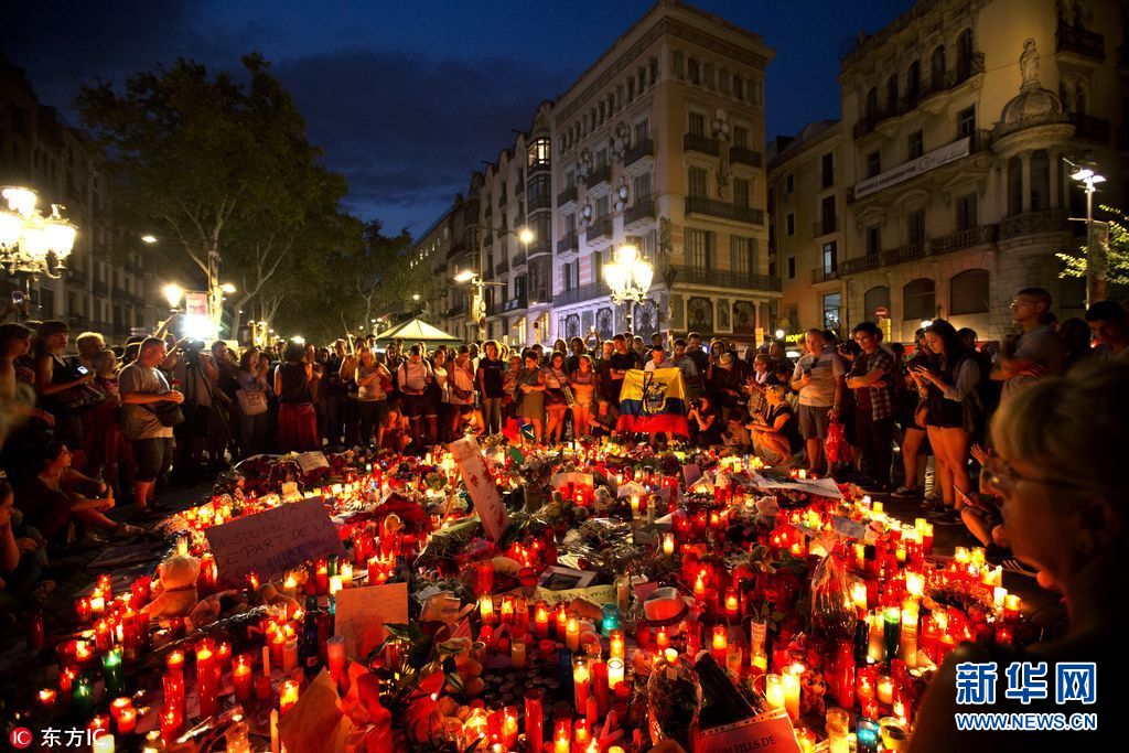 當(dāng)?shù)貢r間2017年8月18日,西班牙巴塞羅那,當(dāng)?shù)孛癖婞c(diǎn)燭獻(xiàn)花悼念恐襲事件遇難者。17日,一輛白色貨車在巴塞羅那市中心蘭布拉大道加泰羅尼亞廣場附近沖撞人群,據(jù)媒體報道,死亡人數(shù)已經(jīng)升至14人。(圖片來源:東方IC)