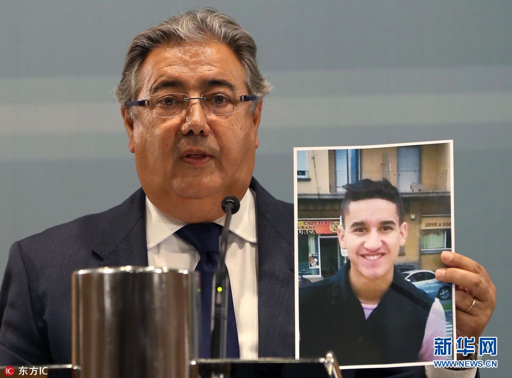 當(dāng)?shù)貢r(shí)間2017年8月21日,西班牙內(nèi)政部長(zhǎng)展示巴塞羅恐襲案嫌犯照片,尤尼斯·阿布雅各布。