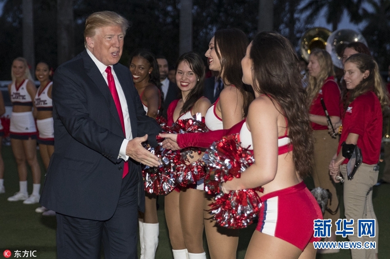當?shù)貢r間2018年2月4日,美國佛州西棕櫚灘,美國總統(tǒng)特朗普與第一夫人梅拉尼婭在高爾夫俱樂部觀看大學(xué)生樂隊的歡迎演出,與美女啦啦隊員握手。據(jù)悉,特朗普夫婦出席在該俱樂部舉辦的超級碗派對。(圖片來源:東方IC)