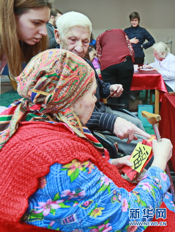 這是7日基輔國立語言大學孔子學院與當地敬老院舉行2018新春聯(lián)歡晚會時的一幕。當晚,孔院30多名師生給敬老院150多名孤殘老人帶來了多個中國文化體驗項目,并表演了精彩的文藝節(jié)目。