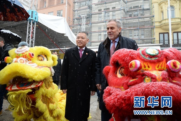 2月12日,中國駐克羅地亞大使胡兆明(左)與克首都薩格勒布市長米蘭·班迪奇在薩格勒布出席為慶祝中國春節(jié)舉辦的舞獅表演活動(dòng)。新華網(wǎng)發(fā)(高磊攝)
