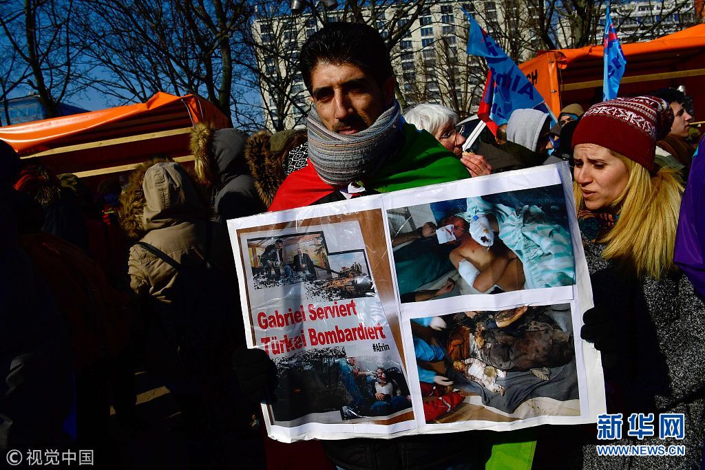 當(dāng)?shù)貢r(shí)間2018年3月3日,德國柏林,當(dāng)?shù)孛癖娕e行游行,抗議土耳其對(duì)敘利亞阿夫林地區(qū)的庫爾德人采取軍事行動(dòng)。(圖片來源:視覺中國)