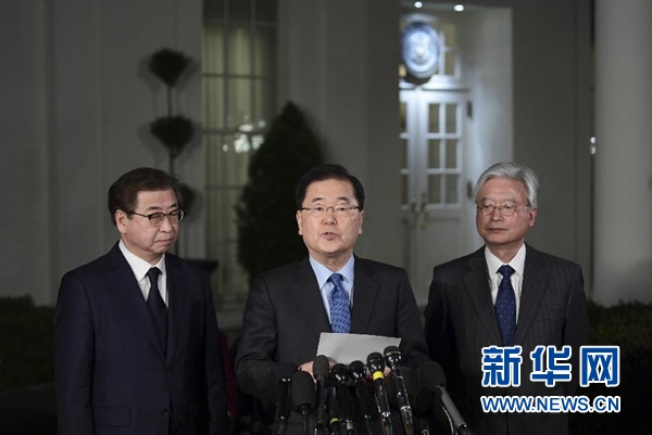 3月8日,正在美國訪問的韓國青瓦臺國家安保室室長鄭義溶(中)在華盛頓白宮說,朝鮮最高領(lǐng)導人金正恩委托韓方向美方轉(zhuǎn)達他希望盡快與美國總統(tǒng)特朗普會面的意愿,特朗普已經(jīng)同意在5月之前與金正恩會面。新華社/美聯(lián)