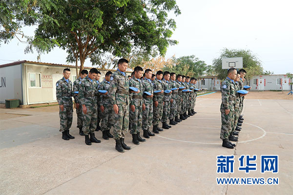 祭奠儀式上,大型機械鳴笛三聲,哀思樂曲響起,全體官兵整裝列隊,集體脫帽為犧牲在維和戰(zhàn)場上的英烈默哀三分鐘。隨后,官兵代表致辭,追憶維和英烈們無私奉獻、舍生取義的光輝事跡,表達為達爾富爾地區(qū)和平建設(shè)而努力奮斗的堅定決心。