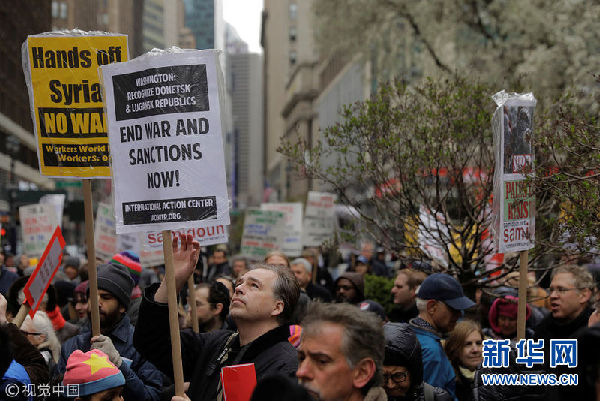4月15日,美國紐約,民眾舉行反戰(zhàn)游行,抗議美英法聯(lián)軍襲擊敘利亞。2018-04-16 07:48:32