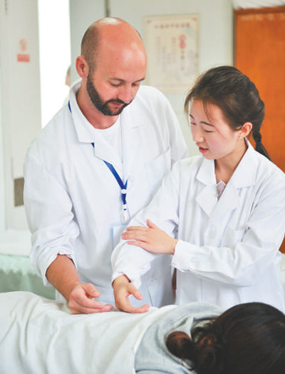 2017年7月,11名西班牙“洋中醫(yī)”來到位于昆明市的云南省中醫(yī)院學習推拿和針灸。圖為中國老師指導“洋中醫(yī)”。人民視覺