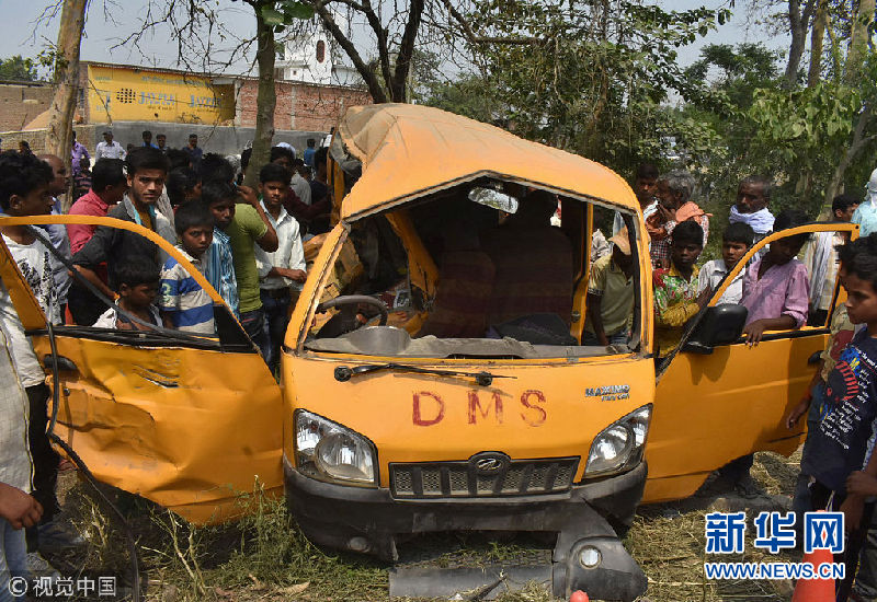 當(dāng)?shù)貢r(shí)間2018年4月26日,一輛載有22名兒童的校車在印度北方邦庫(kù)新加同一輛火車相撞,事故造成13名兒童死亡,8人傷勢(shì)嚴(yán)重。(圖片來(lái)源:視覺(jué)中國(guó))