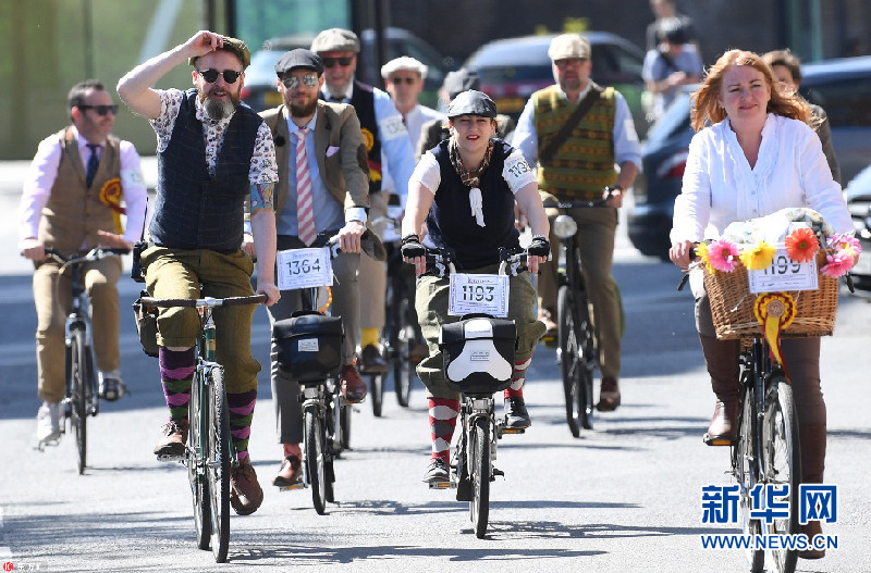 當?shù)貢r間2018年5月5日,英國倫敦,當?shù)嘏e辦復古騎行活動,民眾身穿花呢子服裝騎車穿行在倫敦街頭。今年是該活動舉辦十周年。(圖片來源:東方IC)