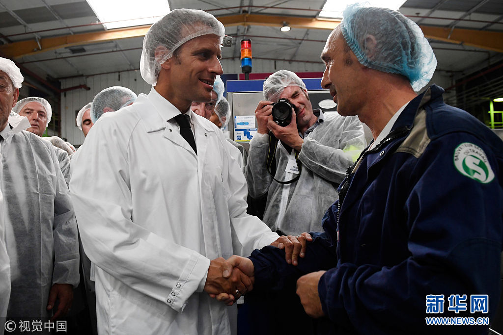 6月20日,法國(guó)普盧維安,法國(guó)總統(tǒng)馬克龍視察當(dāng)?shù)嘏D讨破窂S(chǎng),并品嘗了一份甜點(diǎn)。(圖片來(lái)源:視覺(jué)中國(guó))