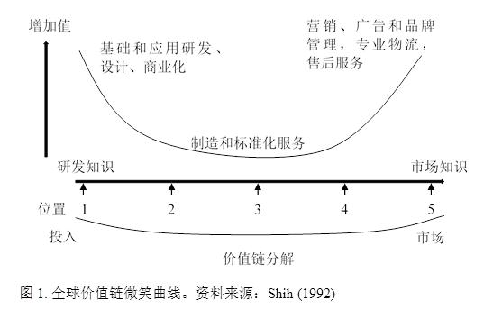 全球價(jià)值鏈構(gòu)建了一個(gè)跨國(guó)或者跨地區(qū)不同公司實(shí)現(xiàn)不同的工序和商業(yè)功能的生產(chǎn)架構(gòu)(Grossman和Rossi-Hansberg,2012)。這個(gè)架構(gòu)是“生產(chǎn)性的(價(jià)值增長(zhǎng)的)通向并且支持最終使用的順序” (Sturgeon 2001)。微笑曲線提出了一種不同的解構(gòu)國(guó)際貿(mào)易的方法。有些國(guó)家專(zhuān)業(yè)化“生產(chǎn)”知識(shí)與研發(fā),而另一些國(guó)家專(zhuān)業(yè)化于制造業(yè),或者品牌營(yíng)銷(xiāo)。因此,一個(gè)產(chǎn)品的增加值不再是完全屬于某一個(gè)國(guó)家,而是整條價(jià)值鏈上的參與者都可以分一杯羹。在為最終產(chǎn)品貢獻(xiàn)價(jià)值的生產(chǎn)工序的鏈條上(既,產(chǎn)品的價(jià)值鏈),一般的工序鏈條開(kāi)始于基礎(chǔ)和應(yīng)用研究與設(shè)計(jì)。這些研究與設(shè)計(jì)活動(dòng)往往會(huì)帶來(lái)新的想法、技術(shù)、新產(chǎn)品設(shè)計(jì)和新的生產(chǎn)工藝。這個(gè)工序鏈條下一環(huán)節(jié)是商業(yè)化這些研究成果,如專(zhuān)利和知識(shí)產(chǎn)權(quán)(想法、論文、知識(shí)等);再下一環(huán)節(jié)是資源的獲取和材料的生產(chǎn)(包括農(nóng)業(yè)產(chǎn)品),零部件的生產(chǎn)和產(chǎn)品的組裝,以及最后環(huán)節(jié)的營(yíng)銷(xiāo)、廣告、品牌管理、物流、商業(yè)服務(wù)和售后服務(wù)。另外,價(jià)值鏈在文獻(xiàn)中的定義是超出中間品貿(mào)易的,它強(qiáng)調(diào)在不同環(huán)節(jié)上領(lǐng)先企業(yè)與供應(yīng)商之間的權(quán)力架構(gòu) (Milberg,2004)。