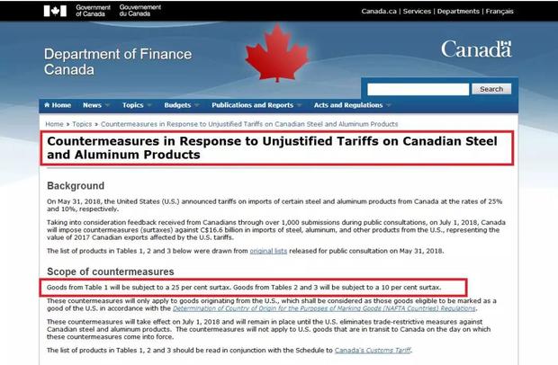 加拿大財(cái)政部官網(wǎng)發(fā)布的公告,標(biāo)題可以說是相當(dāng)?shù)刂笔阈匾芰耍骸秾?duì)加拿大鋼鋁產(chǎn)品受到不公平關(guān)稅待遇的反擊措施》(Countermeasures in Response to Unjustified Tariffs on Canadian Steel and Aluminum Products)。抱怨三連:countermeasures(對(duì)抗措施), in Response to(對(duì)……做出反應(yīng)),unjustified(不公平的)——看得出,加拿大是真生氣了。