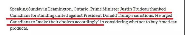 第三,大是大非上一定要團(tuán)結(jié)一致。一說到團(tuán)結(jié),有的人總會(huì)聯(lián)想過于豐富:要么認(rèn)為這是要老百姓放棄自己的思考,要么認(rèn)為必須通過極端方式表達(dá)自己洶涌的激情——我們印象里一向溫和的加拿大,這次是怎么做的?用美聯(lián)社報(bào)道的話:特魯多在利明頓市演講時(shí)表示:感謝加拿大民眾團(tuán)結(jié)一致反對(duì)特朗普的制裁,并鼓勵(lì)民眾根據(jù)自己的實(shí)際情況做出要不要買美國(guó)產(chǎn)品的選擇。特魯多為什么這樣說?事實(shí)上,自從G7之后特朗普攻擊特魯多“軟弱”“虛偽”以來,推特上“購買加拿大產(chǎn)品”“抵制美國(guó)貨”“抵制美國(guó)”“擺脫川普”等話題就在不斷升溫,很多加拿大人調(diào)整了消費(fèi)習(xí)慣,轉(zhuǎn)而購買自己國(guó)家的產(chǎn)品。網(wǎng)友們的這些抵制活動(dòng),被特魯多稱為是一股“愛國(guó)熱情”。