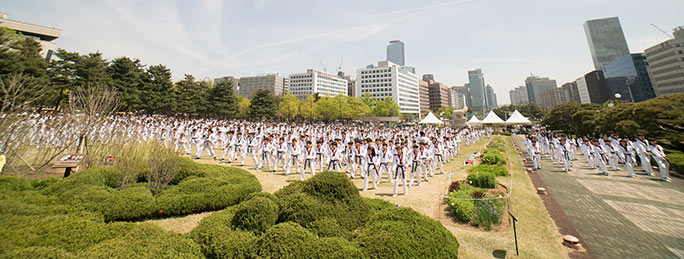 參加本次活動的既有年輕人,也有老年人。整個表演經(jīng)過精心編排,持續(xù)了10分鐘時間,所有參與者在表演中都穿著傳統(tǒng)的跆拳道服。
