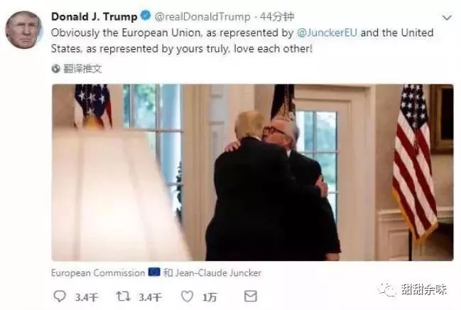 畢竟,到訪美國(guó)的歐盟委員會(huì)主席容克,不僅得到了美國(guó)媒體濃墨重彩的報(bào)道,更在特朗普的推特上,將白宮玫瑰園的浪漫延續(xù)了下去——《經(jīng)濟(jì)學(xué)人》給這次見(jiàn)面取了個(gè)唯美貼切的標(biāo)題:Sealed with a kiss(以吻封緘)。(哈哈哈,莫名覺(jué)得這首歐美經(jīng)典情歌用在這里居然有說(shuō)不出的貼切,《經(jīng)濟(jì)學(xué)人》取標(biāo)題的能力也真是要給個(gè)大寫的服字?。?/p>