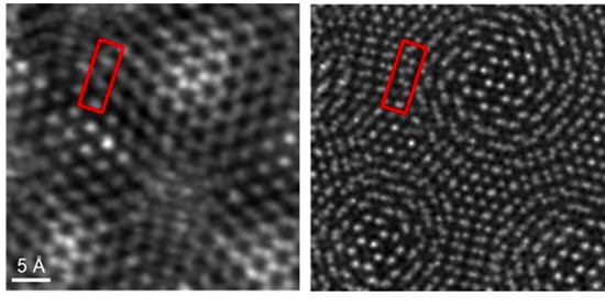 這是領(lǐng)先于過去成像方法的一個(gè)重要步驟,以前看不清是因?yàn)樘綔y(cè)器只收集了一部分散射的電子。此前,在同樣的低電壓情況下,得到的空間分辨率一般小于0.1納米。兩張圖相比,一個(gè)線條模糊,一個(gè)能看得顆粒分明。