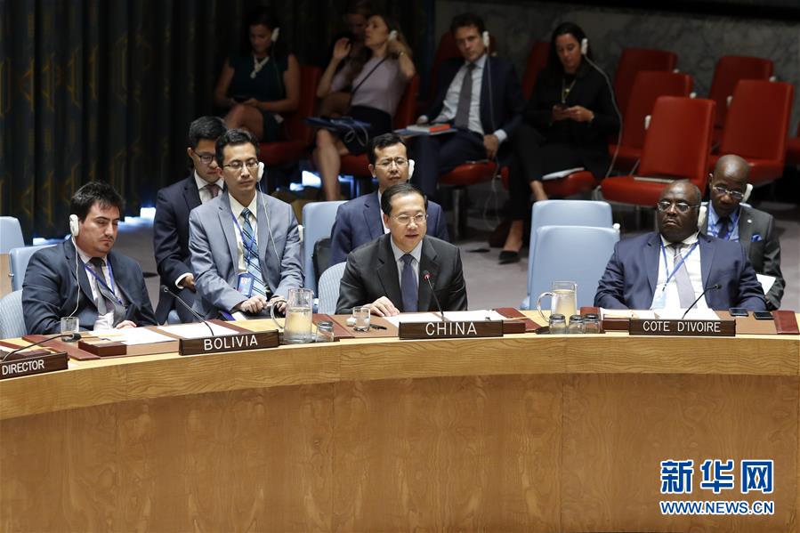 9月6日,在位于紐約的聯(lián)合國總部,中國常駐聯(lián)合國代表馬朝旭(前中)在安理會(huì)敘利亞化武問題公開會(huì)上發(fā)表講話。新華社記者李木子 攝