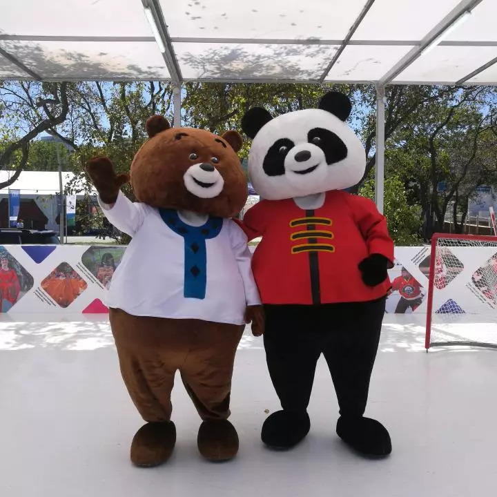 第四屆東方經(jīng)濟(jì)論壇配套展示項(xiàng)目遠(yuǎn)東風(fēng)采街上,可愛(ài)的“中國(guó)熊貓”和“俄羅斯棕熊”一起打冰球(新華社記者蔣國(guó)鵬攝)