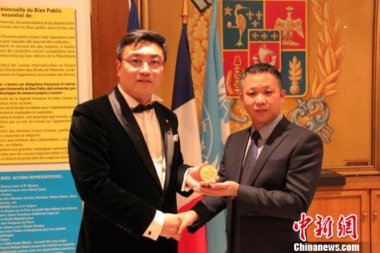 9月21日晚,中國工筆畫家崔景哲(左)在巴黎榮獲全球公益聯(lián)盟文學(藝術(shù))金質(zhì)勛章,也是此次頒獎典禮所有獲獎者中唯一一位中國人。江蘇凱旋體育文化董事長吳愛華等知名人士對崔景哲的獲獎表示祝賀。李洋 攝
