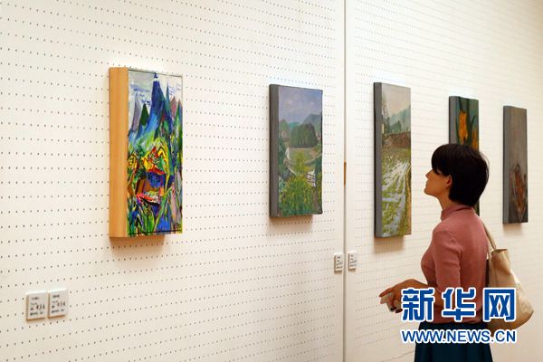10月8日,在日本東京世田谷美術(shù)館,一位觀眾欣賞展出的中國藝術(shù)家畫作。 新華社記者王可佳攝