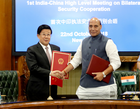 10月22日,中國與印度首次執(zhí)法安全高級(jí)別會(huì)晤在新德里舉行。國務(wù)委員、公安部部長(zhǎng)趙克志與印度內(nèi)政部部長(zhǎng)辛格共同簽署了《中華人民共和國公安部與印度共和國內(nèi)政部合作協(xié)議》。