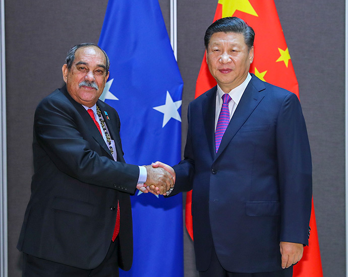 11月16日,國家主席習近平在莫爾茲比港分別會見建交太平洋島國領導人。這是習近平會見紐埃總理塔拉吉。新華社記者 丁林 攝
