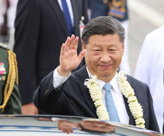 當?shù)貢r間近午時,習近平步出專機艙門,菲律賓政府高級官員在舷梯旁熱情迎接,軍樂隊奏迎賓曲。習主席代表中國政府和中國人民向菲律賓政府和人民致以誠摯問候和良好祝愿。
