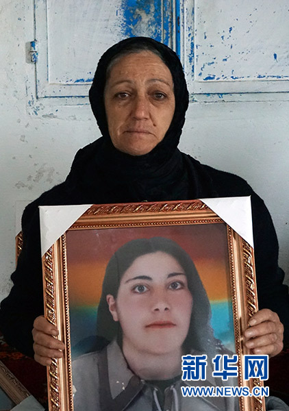 在敘利亞南部蘇韋達(dá)省舍比克村,娜赫拉·阿布·阿馬爾手舉遇害親人照片(11月14日攝)。新華社記者 汪健 攝