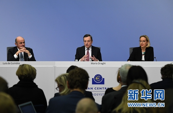1月24日,在德國法蘭克福的歐洲中央銀行總部,歐洲央行行長德拉吉(中)和副行長德金多斯(左)出席新聞發(fā)布會。新華社記者 逯陽 攝