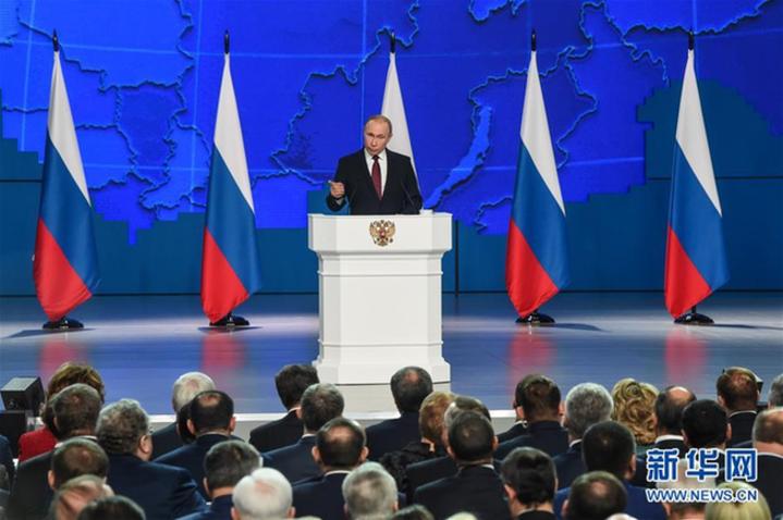 2月20日,在俄羅斯首都莫斯科,俄總統(tǒng)普京向議會(huì)上下兩院發(fā)表國情咨文。 新華社發(fā)(葉甫蓋尼·西尼岑攝)