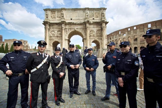 2016年5月2日,中意首次聯(lián)合警務(wù)巡邏在意大利羅馬啟動。在意大利羅馬君士坦丁凱旋門外,中方警員與意方警員合影。新華社記者金宇攝