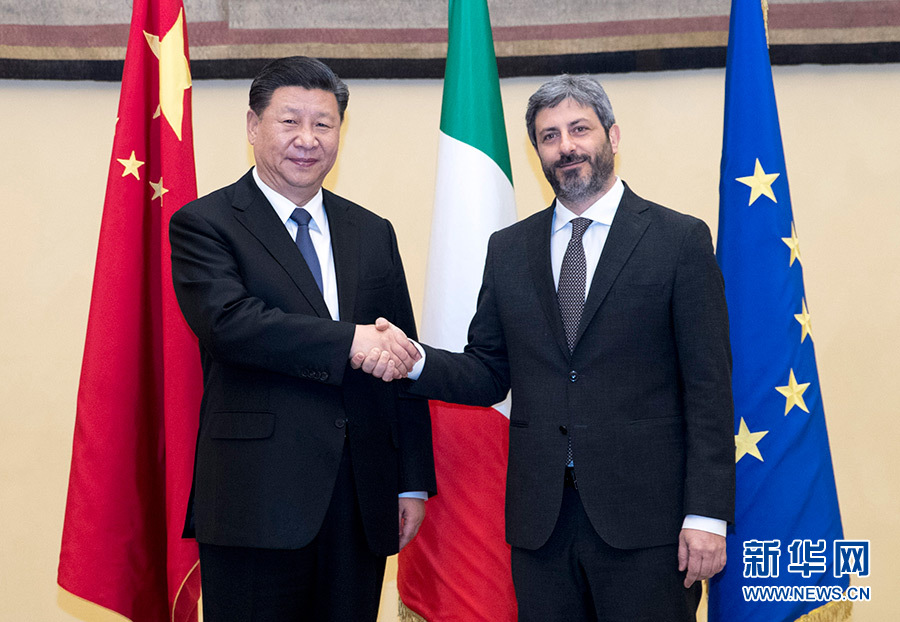 3月22日,國(guó)家主席習(xí)近平在羅馬會(huì)見(jiàn)意大利眾議長(zhǎng)菲科。 新華社記者 王曄 攝