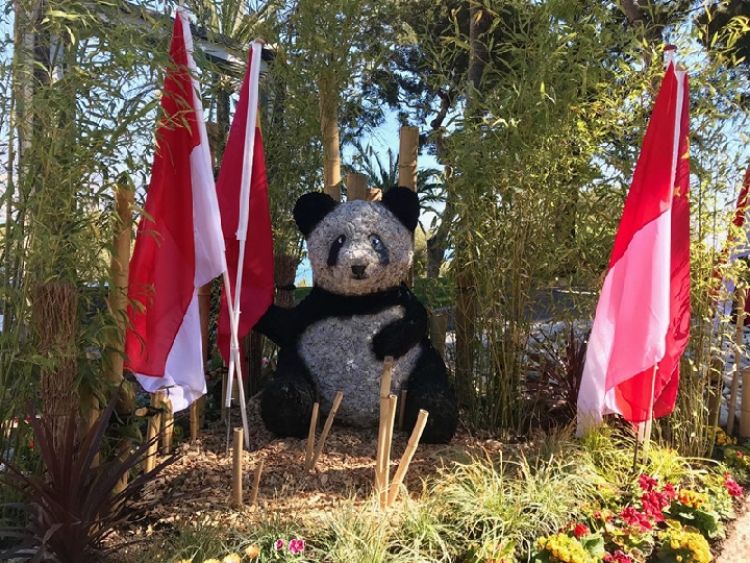 為迎接中國(guó)貴賓,摩納哥街心花園立起一個(gè)大熊貓雕塑。新華社記者趙丁喆攝