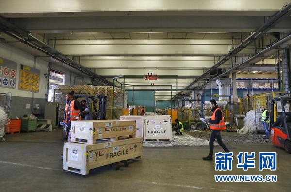 4月9日,在意大利米蘭馬爾彭薩機場,工作人員將中國流失文物藝術(shù)品運送上飛機。 新華社記者 程婷婷 攝